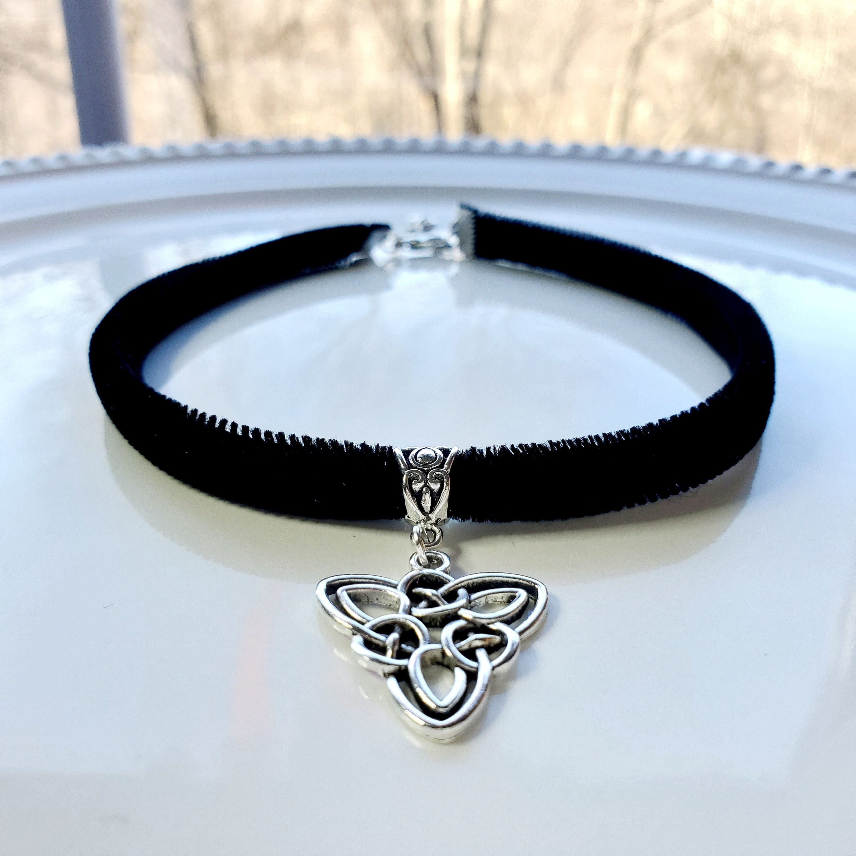 This beautiful velvet choker is 13 inches with a 2inch extension chain that will fit most neck sizes. This choker has a silver antique look Celtic knot charm