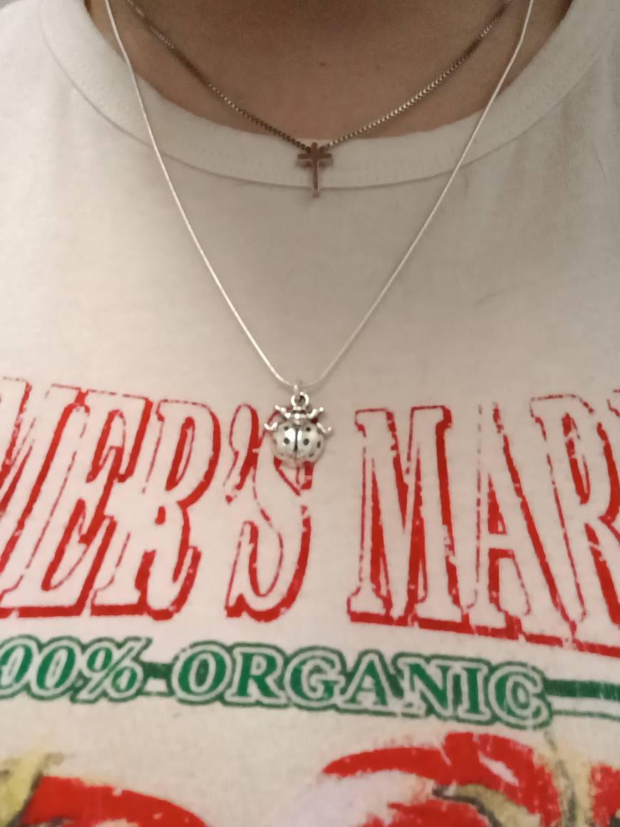 Ladybug necklace with antique silver ladybug charm on 18 inch sterling silver snake chain with 2inch extension chain and lobster clasp. The Ladybug is a symbol of good luck.