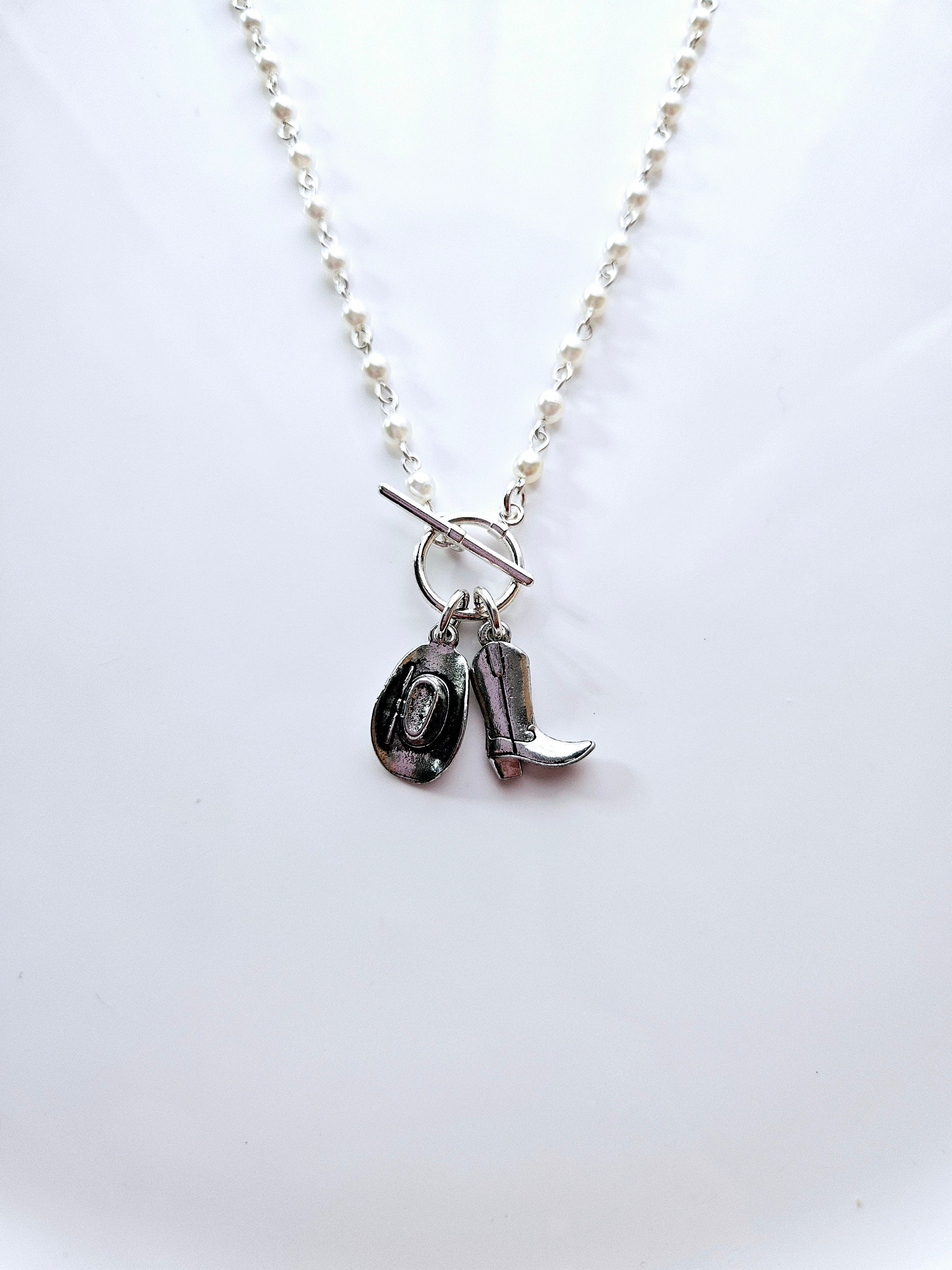 cowboy boot necklace on pearl rosary bead chain made with antique sterling silver plated 1-inch 3D cowgirl boot and antique silver hat charm on a 17-inch white pearl and silver wire wrapped rosary bead necklace with toggle clasp. if you would like 18-inch chain please place your request in personalization.