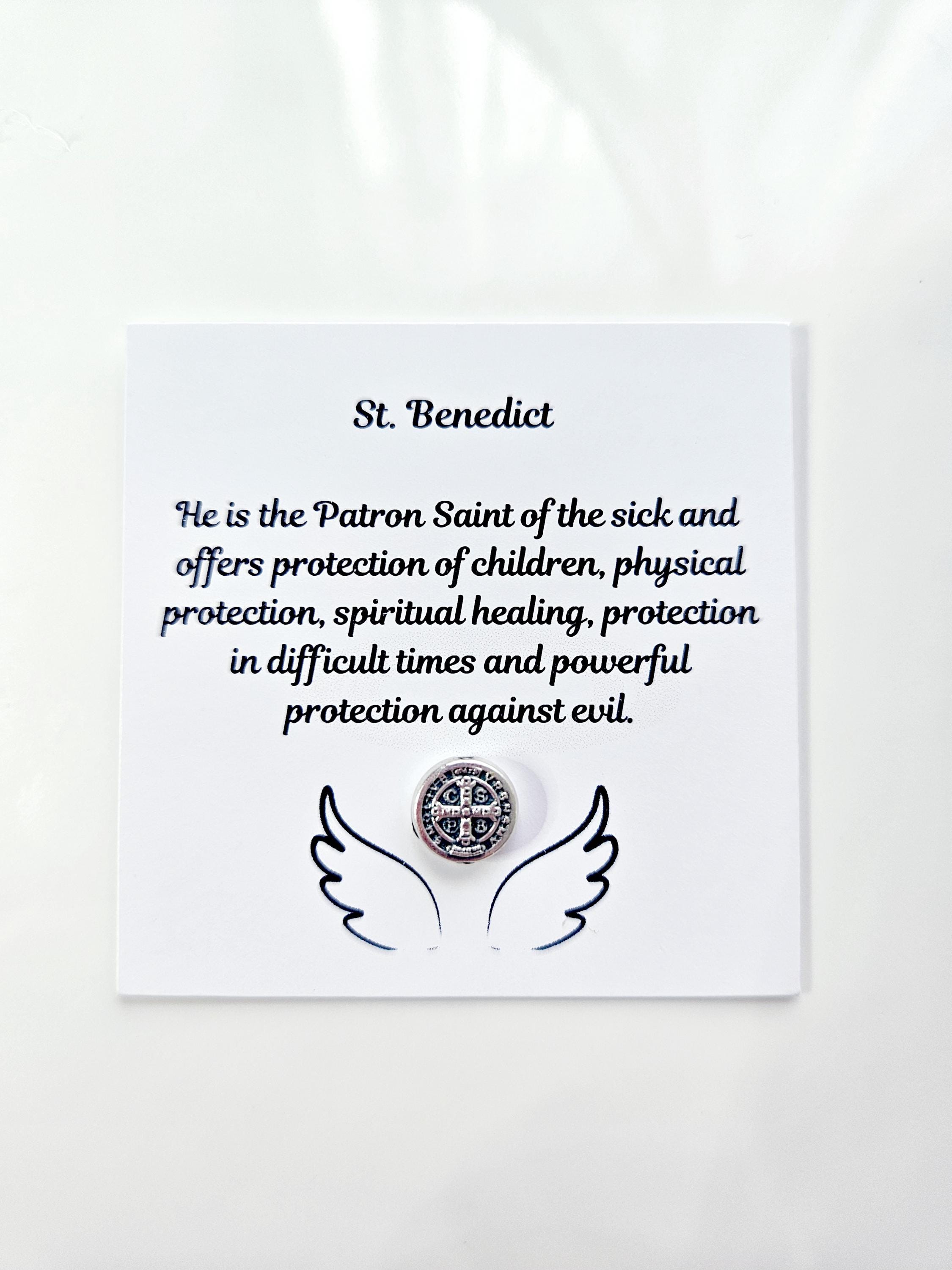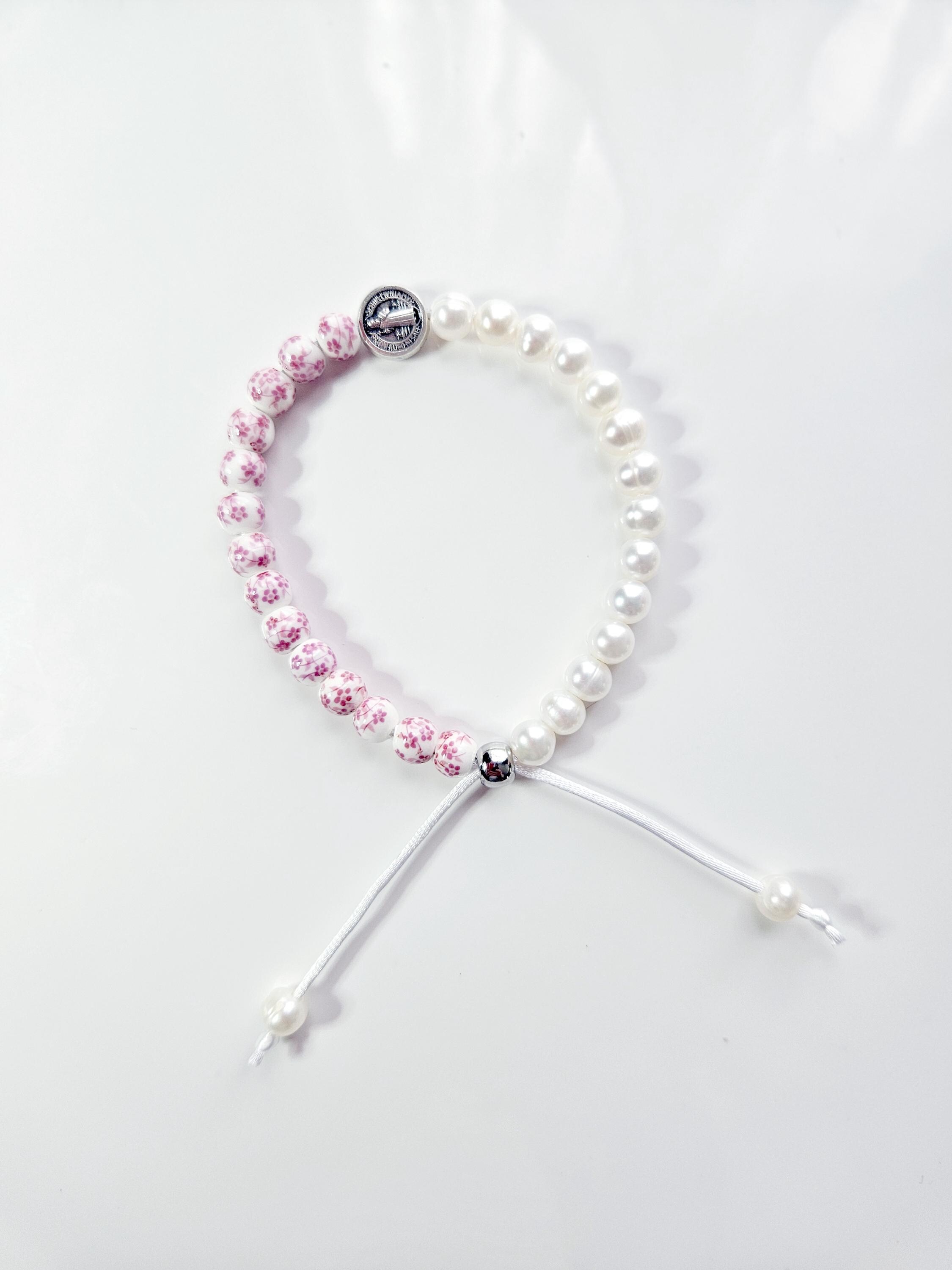 St. Benedict bracelet made with 6mm natural white freshwater pearls, 6mm white and rose floral porcelain beads with Patron Saint charm of your choice on a white satin cord that adjusts to your wrist size. These patron saint bracelets are gift wrapped and come with a beautiful card that explains what the saint was known for.