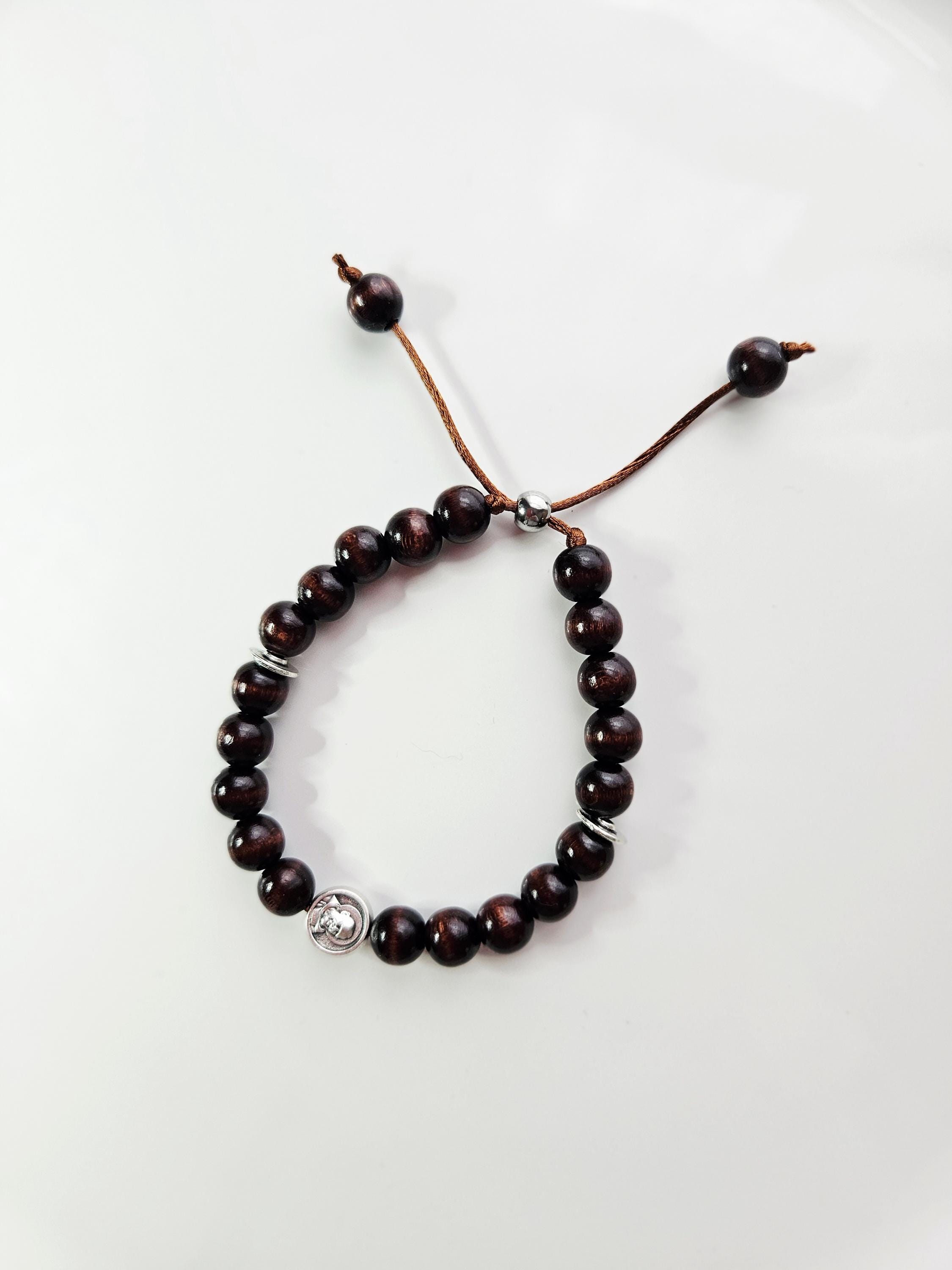 Patron saint bracelet Padre Pio is made with 8mm dark brown wooden beads, antique silver rondelle beads and antique silver Padre Pio charm with slider clasp that fits all wrists.