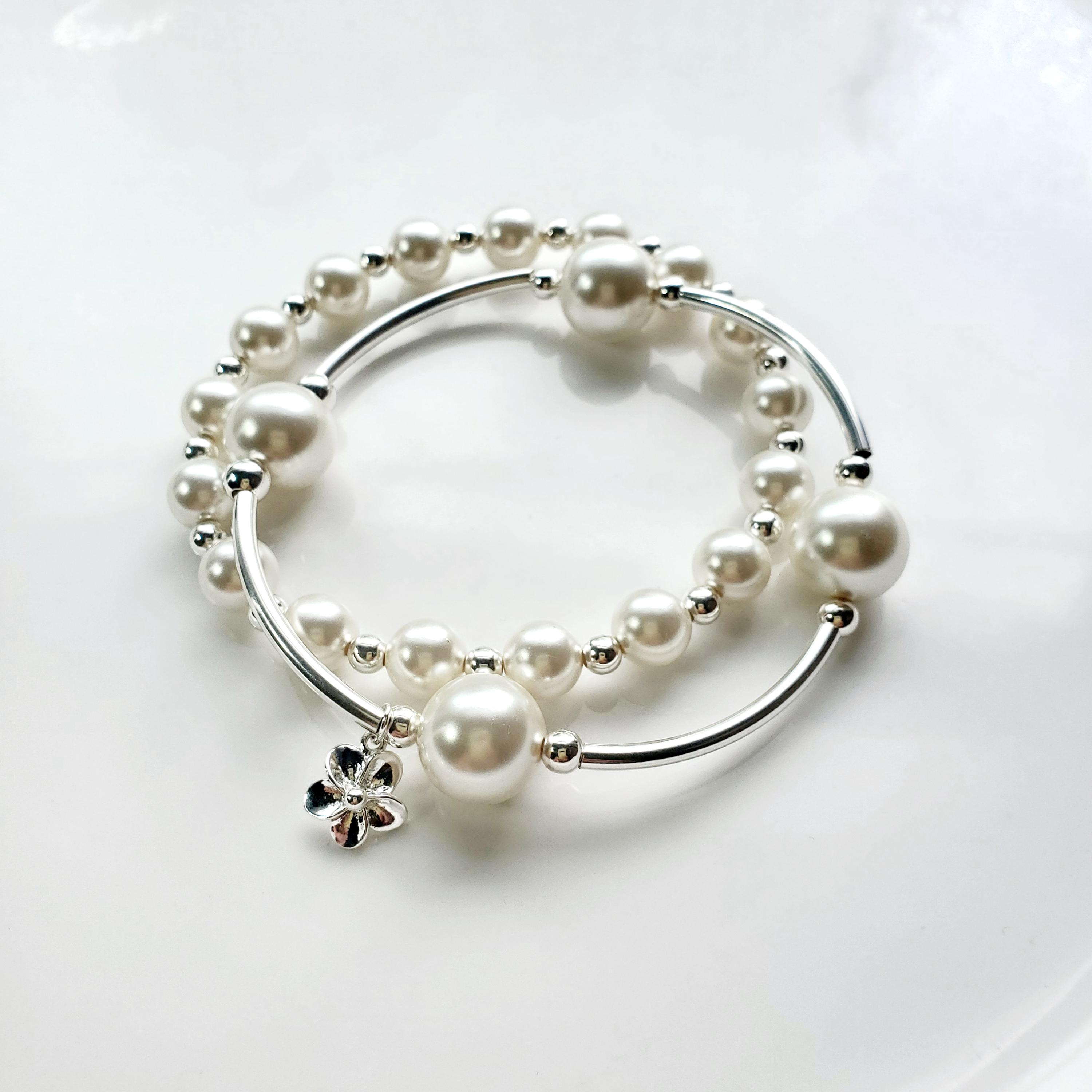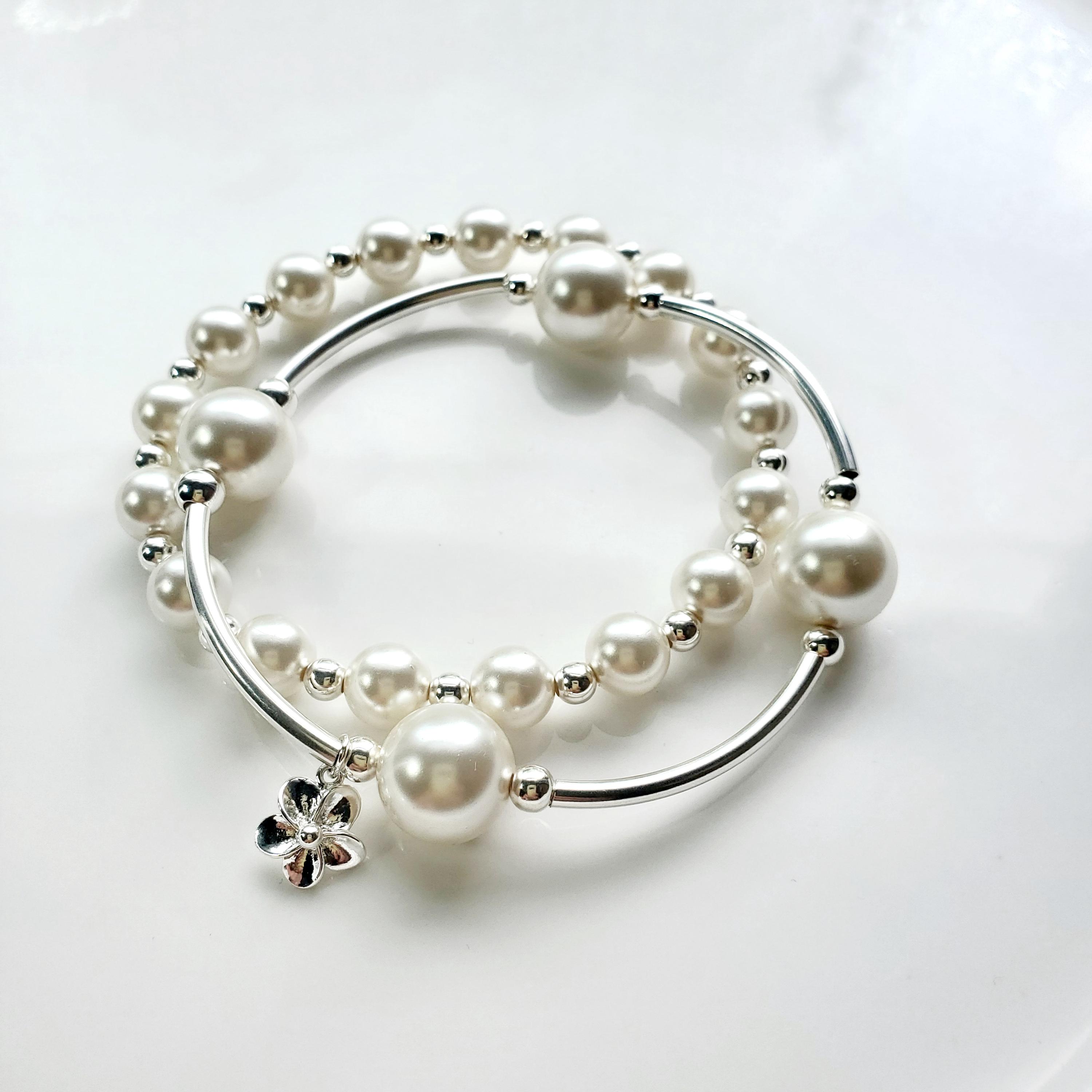 This beautiful bracelet is made with 12mm white Austrian crystal pearl beads, sterling silver beads, and sterling silver Plumeria charm. This bracelet is sold gift wrapped with a beautiful card explaining the meaning of the bracelet.