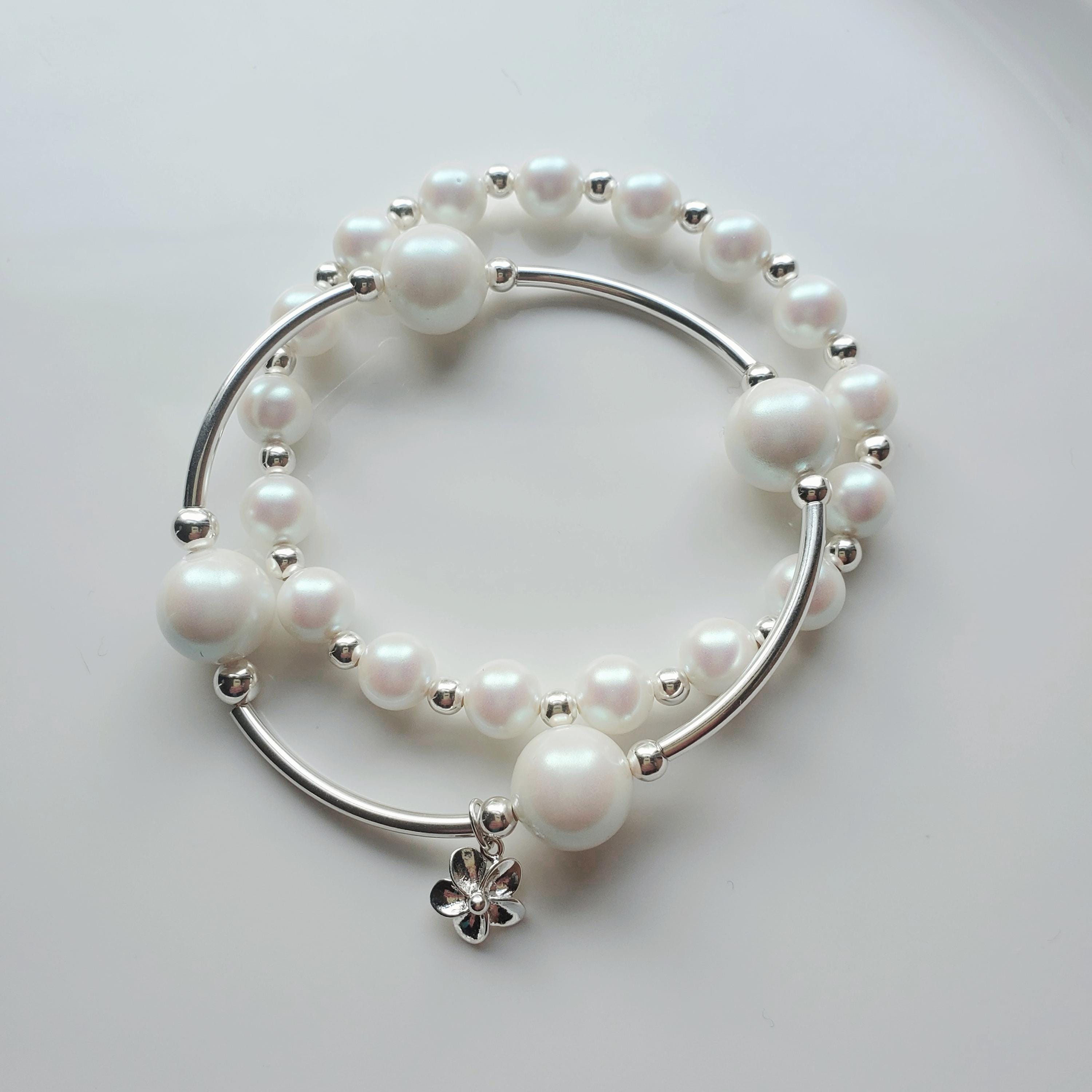 This beautiful bracelet is made with 12mm and 8mm white Austrian crystal pearls and sterling silver Plumeria flower charm. This bracelet ships gift wrapped with a card explaining the meaning of the bracelet.